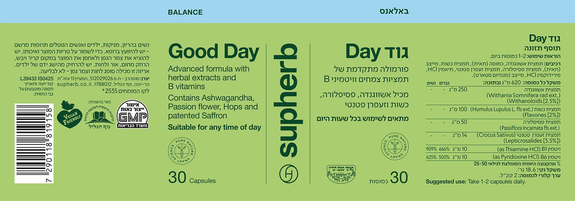 גוד DAY היא פורמולה מתקדמת המשלבת תמציות צמחים, זעפרן פטנטי מגובה מחקרים קליניים וויטמיני B. הרכב ייחודי זה פותח לסייע בתמיכה באיזון טבעי של הגוף והנפש, ומתאים לשימוש יומיומי בשעות היום או הלילה לפי הצורך.