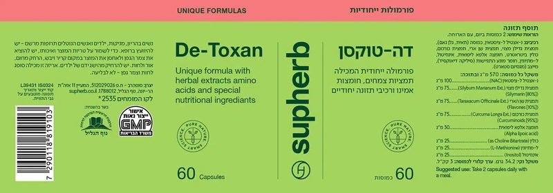 דה טוקסן מבית סופהרב - פורמולה ייעודית המשלבת תמציות צמחים נבחרות: גדילן מצוי, כורכום ושן הארי, עם חומצות אמינו ל-מתיונין, נ-אצטיל ל-ציסטאין (N.A.C) ורכיבים נוספים. פורמולה זו פותחה בקפידה לסייע לתמיכה במגוון תהליכים בגוף.