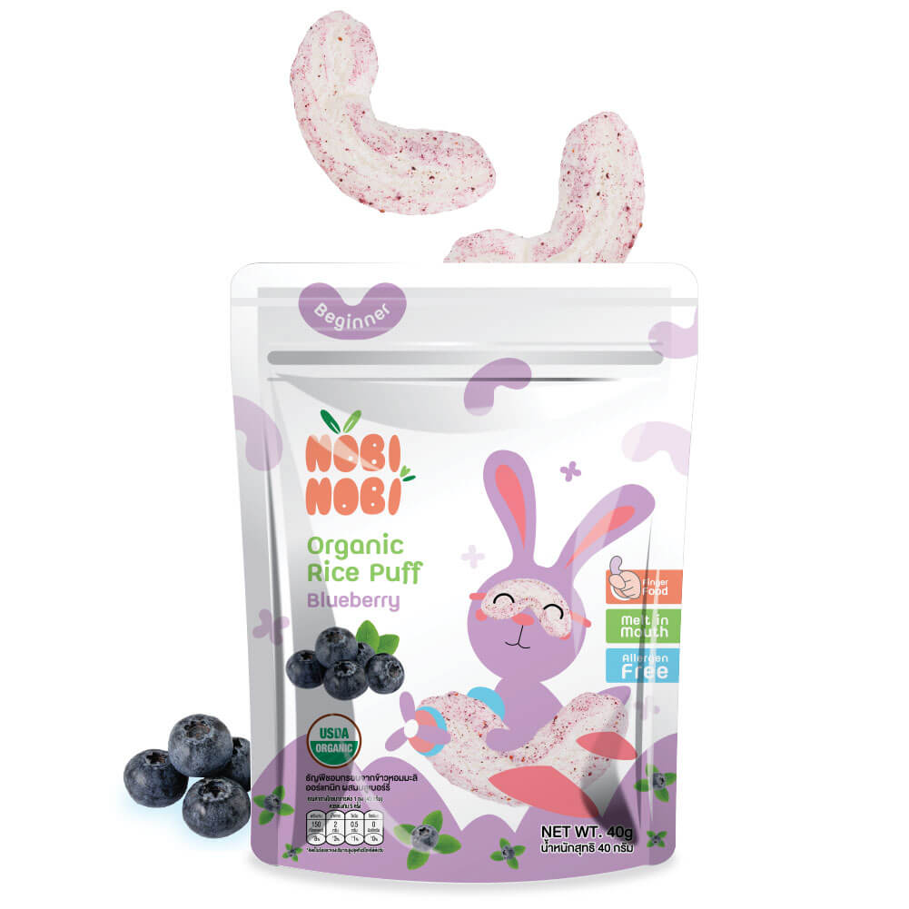 חטיף אורז יסמין אורגני בטעם אוכמניות, עשוי מ־100% דגני אורז יסמין מלאים וללא גלוטן. בעל מרקם קל הנמס בפה, מותאם לשלב החשיפה הראשונית למזון מוצק ולפיתוח מיומנויות אכילה, תוך שילוב טעם פירותי עדין.