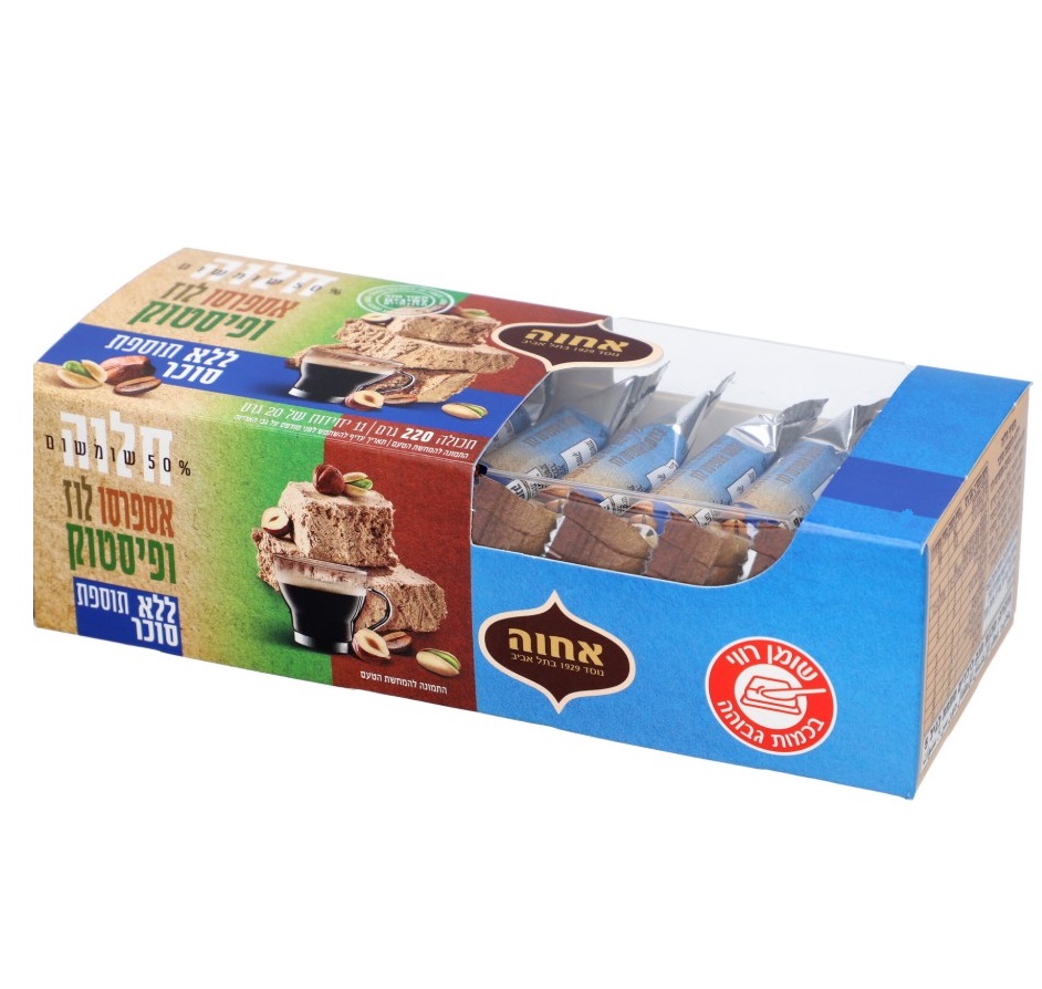 חטיפי חלוה פריכים ומלאי טעם, ללא תוספת סוכר, במגוון טעמים ייחודיים: אספרסו, לוז ופיסטוק. מתאים כחטיף מתוק אך מזין, מושלם לנשנוש בין הארוחות או כקינוח קל.