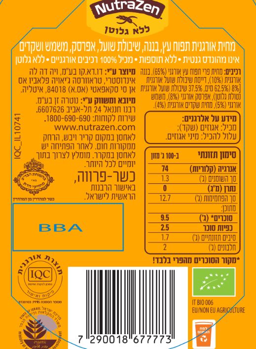 רכיבים: מחית תפוח עץ אורגנית (60%), בננה אורגנית (10%), דייסת שיבולת שועל אורגנית [8% (62.5% מים, 37.5% שיבולת שועל אורגנית נטולת גלוטן)], אפרסק אורגני (8%), משמש אורגני (5%), מחית שקדים אורגנית (4%)