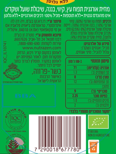 ארוחת פירות אורגנית עם שיבולת שועל ומחית שקדים - שילוב טבעי של תפוח, קיווי ובננה. ללא גלוטן, טבעוני, 100% רכיבים אורגניים וללא תוספות מלאכותיות. מתאים לארוחה קלילה ומזינה בכל שעה.
