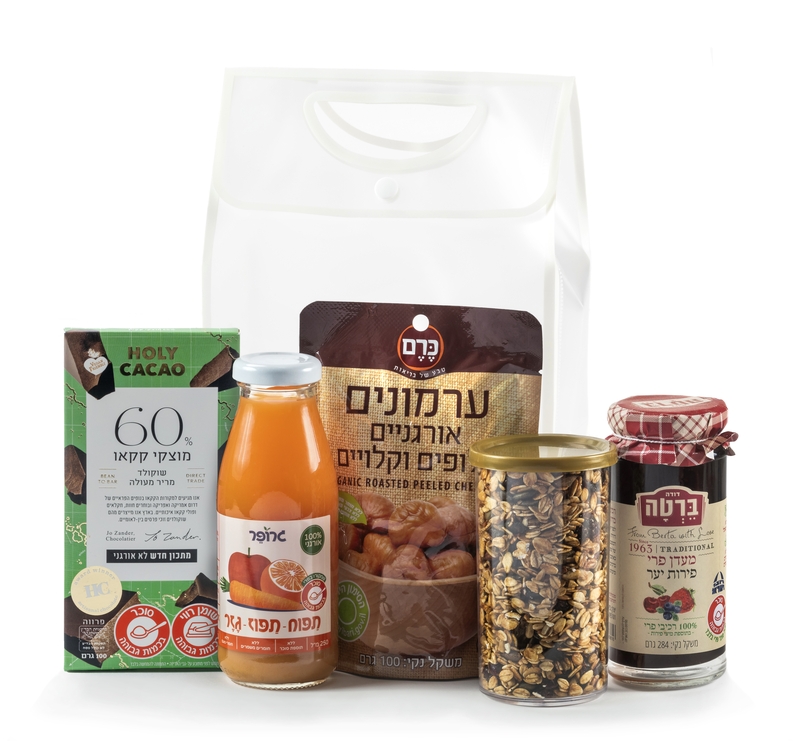 מארז אלגנטי בתיק נשיאה לבן עם סגירת כפתור, המשלב פירות מתוקים, גרנולה פריכה ושוקולד איכותי למתנה טעימה, אסתטית ומאוזנת.