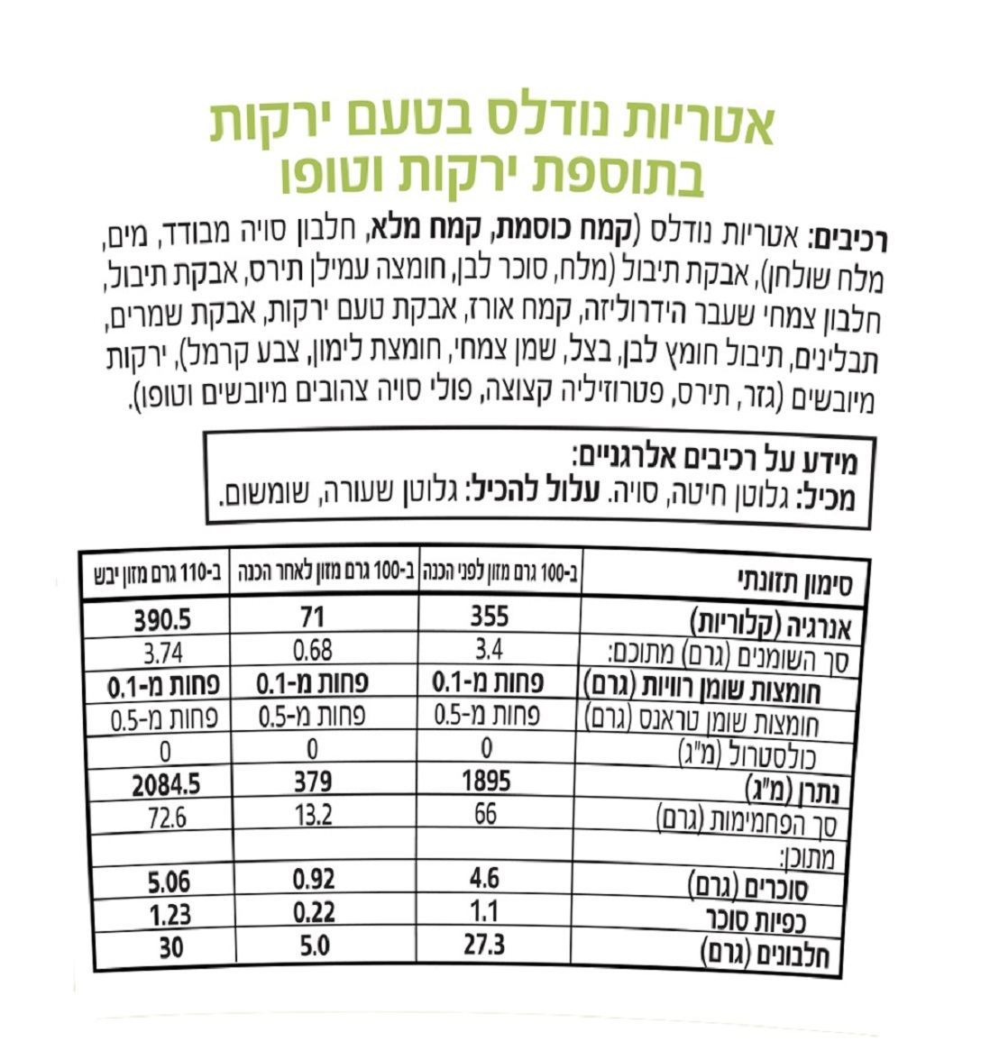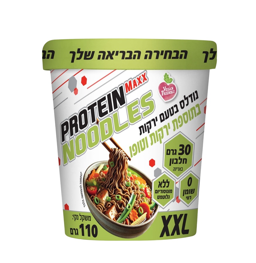 פרוטאין מקס נודלס בטעם ירקות עם טופו להכנה מהירה, עם 30 גרם חלבון בקופסה אחת בלבד. מנה ענקית של כ-110 גרם, משביעה ונוחה להכנה - פשוט הוסיפו מים חמים, המתינו 5-7 דקות ותיהנו מארוחה חמה ומזינה.