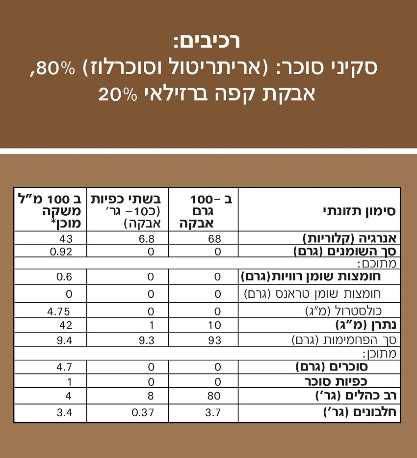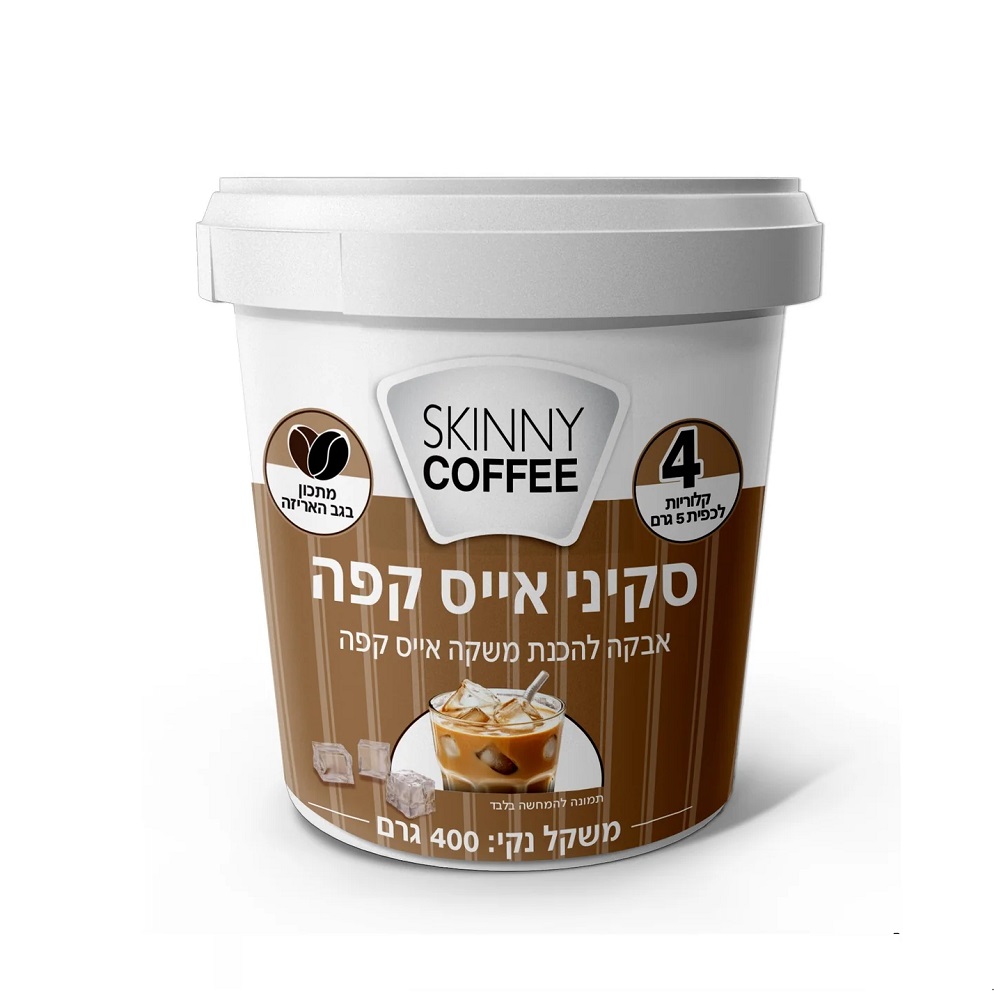 סקיני אייס קפה היא אבקה להכנת משקה קפה ללא סוכר, המבוססת על אריתריטול וקפה נמס איכותי. הפורמולה מציעה טעם עשיר ומרקם מפנק, עם 4 קלוריות בלבד לכפית ויחס שימוש נוח של 1:1, המתאים להכנת אייס קפה, נס קפה חם, וכן לשילוב באפייה ובקינוחים.