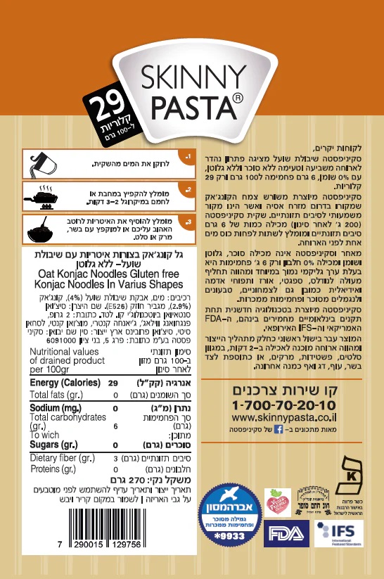 סקיני פסטה קונג’אק עם שיבולת שועל, קלורי נמוך ומוכן לאכילה תוך 2 דקות. ללא גלוטן, סוכר, נתרן וחומרים משמרים, הפסטה טבעונית ומגיעה במרקם רך ונעים. אידיאלית לארוחות מהירות ומזינות, בשילוב עם רטבים או מרקים לפי בחירה. 29 קלוריות ל-100 גרם.