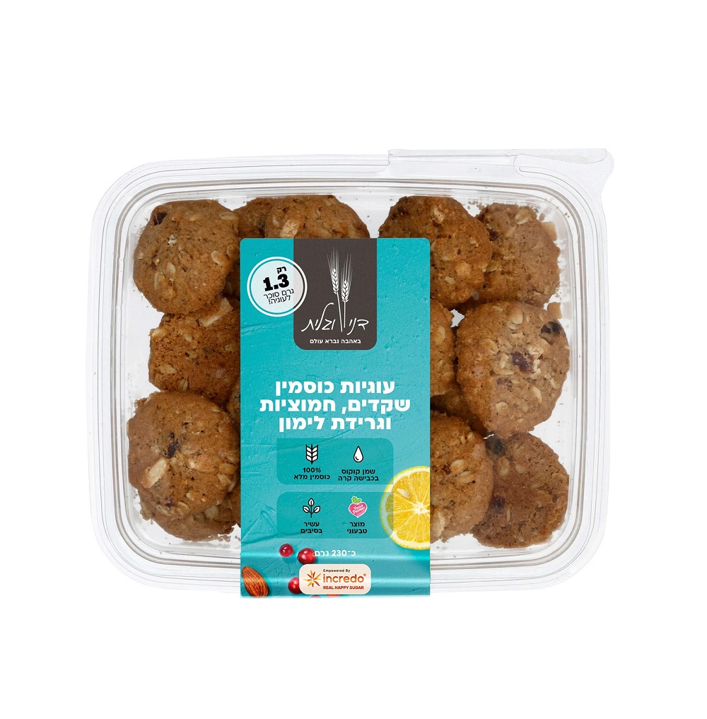 עוגיות כוסמין שקדים עם חמוציות וגרידת לימון, מציעות שילוב טעמים טבעי ורענן ומתאימות במיוחד למי שמעדיף להפחית בסוכר. כל עוגייה מכילה 1.3 גרם סוכר בלבד ו־4.8 גרם פחמימה. העוגיות ממותקות ב־Incredo® Sugar - סוכר קנים טבעי המתמוסס במהירות על קולטני הטעם ומאפשר שימוש בכמות מופחתת של סוכר לצד מתיקות מורגשת ונעימה.