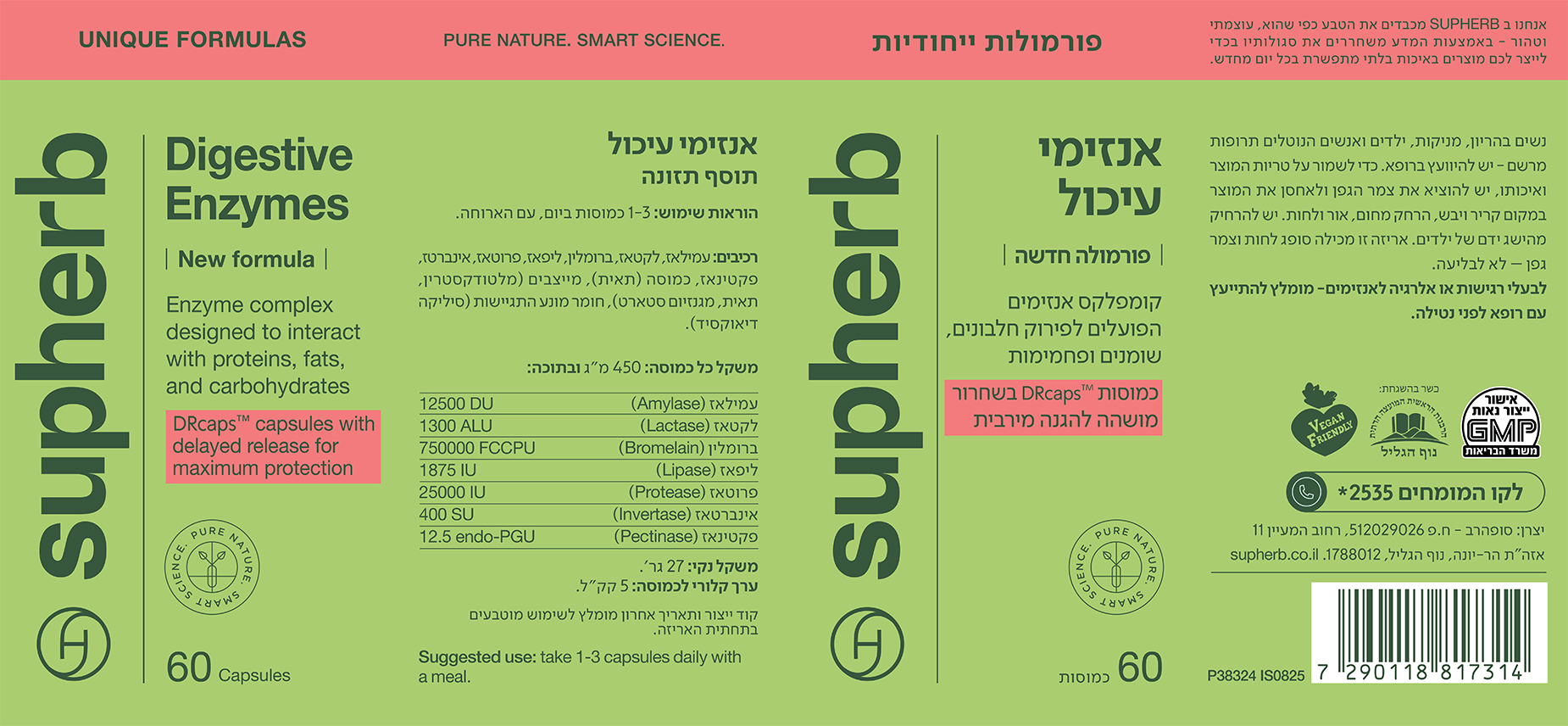 אנזימי עיכול בשחרור מושהה - פורמולה חדשה ומעודכנת בהתאם להנחיות משרד הבריאות. ההרכב המעודכן כולל שבעה אנזימים: עמילאז, לקטאז, פרוטאז, ליפאז, אינברטאז, פקטינאז וברומלין, הממלאים תפקיד חשוב בפירוק פחמימות, סיבים תזונתיים וחלבונים.