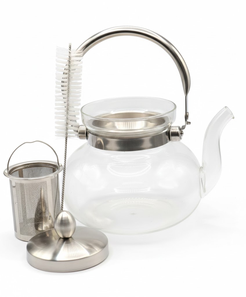 קנקן חליטה איכותי מזכוכית עמידה לחום, מתאים לשימוש על להבת גז וכיריים חשמליות. כולל מסננת נירוסטה פנימית נשלפת לחליטת עלי תה או צמחים. קל לשטיפה ועמיד במדיח כלים.
