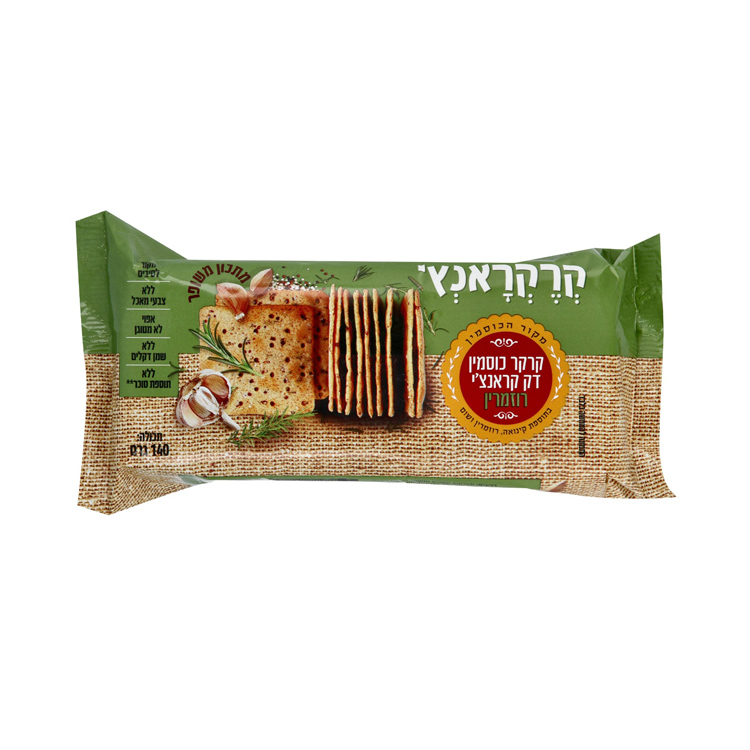 קרקר כוסמין דק ופריך עם נגיעות רוזמרין, המעניק טעם ארומטי ומיוחד. עשוי מקמח כוסמין איכותי, כל פרוסה מציעה פריכות מושלמת ונשנוש מרענן, שמתאים גם כמלווה לממרחים, גבינות וסלטים.