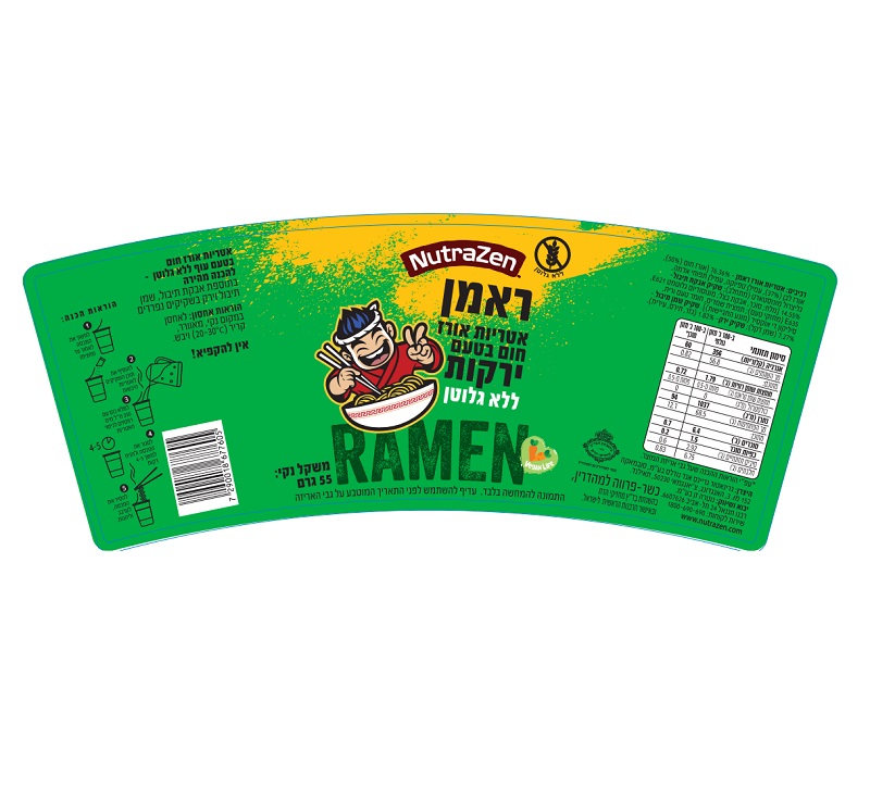 רכיבים: אטריות אורז ראמן 76.36% (אורז חום 50%, אורז לבן 37%, עמילן טפיוקה, עמילן תפוחי אדמה, גליצרול מונוסאטראט), שקיק אבקת תיבול 14.55% (מלח, סוכר, אבקת בצל, מונוסודיום גלוטומט E621, מחזקי טעם E635, חומרי טעם וריח, תמצית שמרים, סיליקון די אוקסיד), שקיק שמן תיבול 7.2% (שמן דקל), שקיק ירק 1.82% (גזר, תירס, עירית).