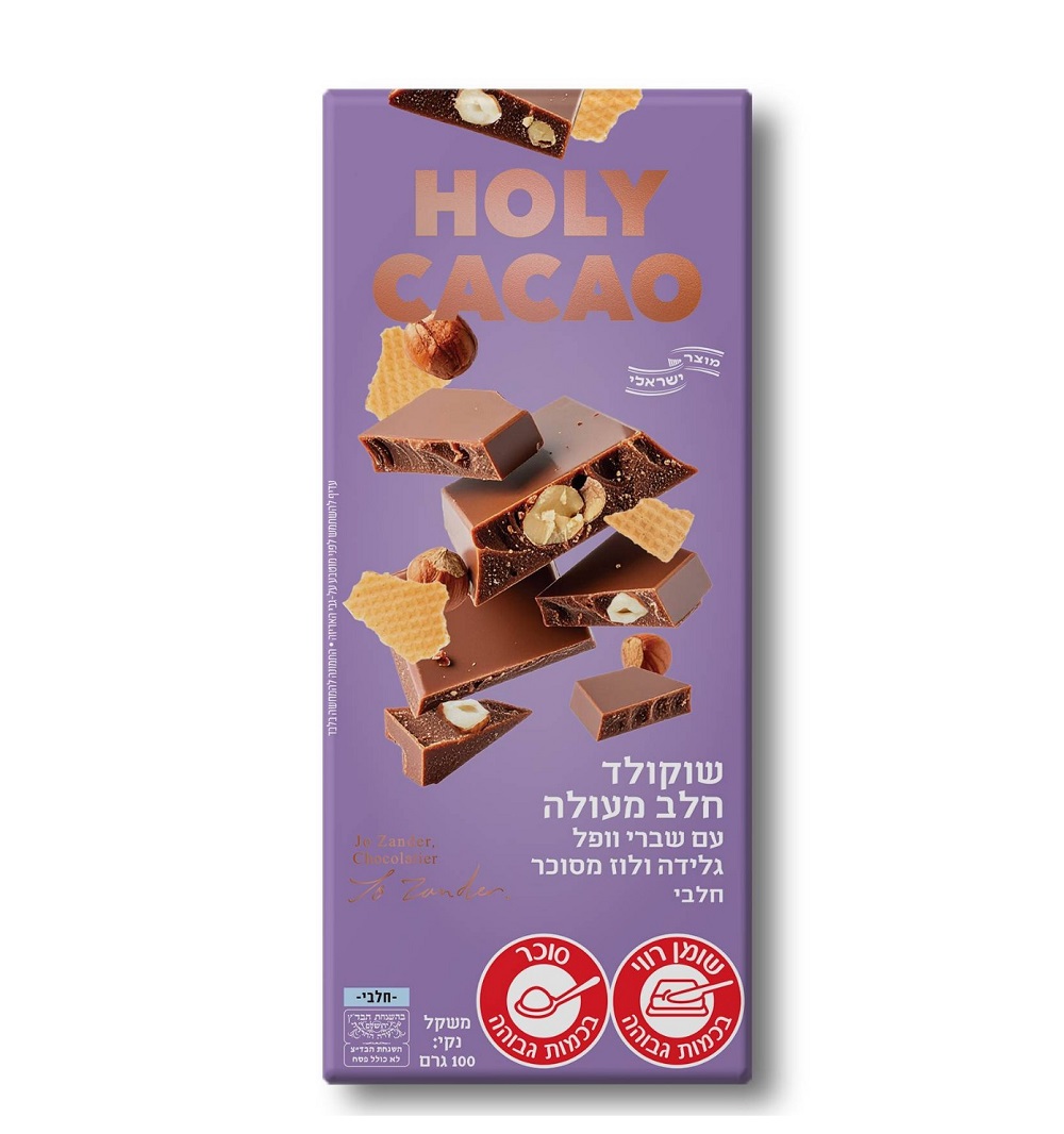 הולי קקאו - שוקולד חלב עשיר המשלב שברי וופל גלידה פריכים ולוז מסוכר, ליצירת מרקם מתוק וקראנצ’י עם נוכחות אגוזית עדינה. הטעמים משתלבים לשוקולד מלא עומק, המעניק חוויית נשנוש מפנקת ורב־שכבתית.