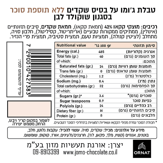 טבלת שוקולד טבעונית על בסיס שקדים, ללא תוספת סוכר, בסגנון שוקולד לבן קלאסי. בעלת טעם עשיר ועדין, מתיקות טבעית בלבד וערך גליקמי נמוך. מתאימה לנשנוש, אפייה או תוספת לקינוחים, עם מרקם חלק ונמס בפה. עשויה רכיבים טבעיים מהצומח, ללא חומרים משמרים או צבעי מאכל, וללא הנדסה גנטית. *תכולת הסוכר נובעת מפולי הקקאו ושאריות בתחליפי הסוכר הטבעיים.