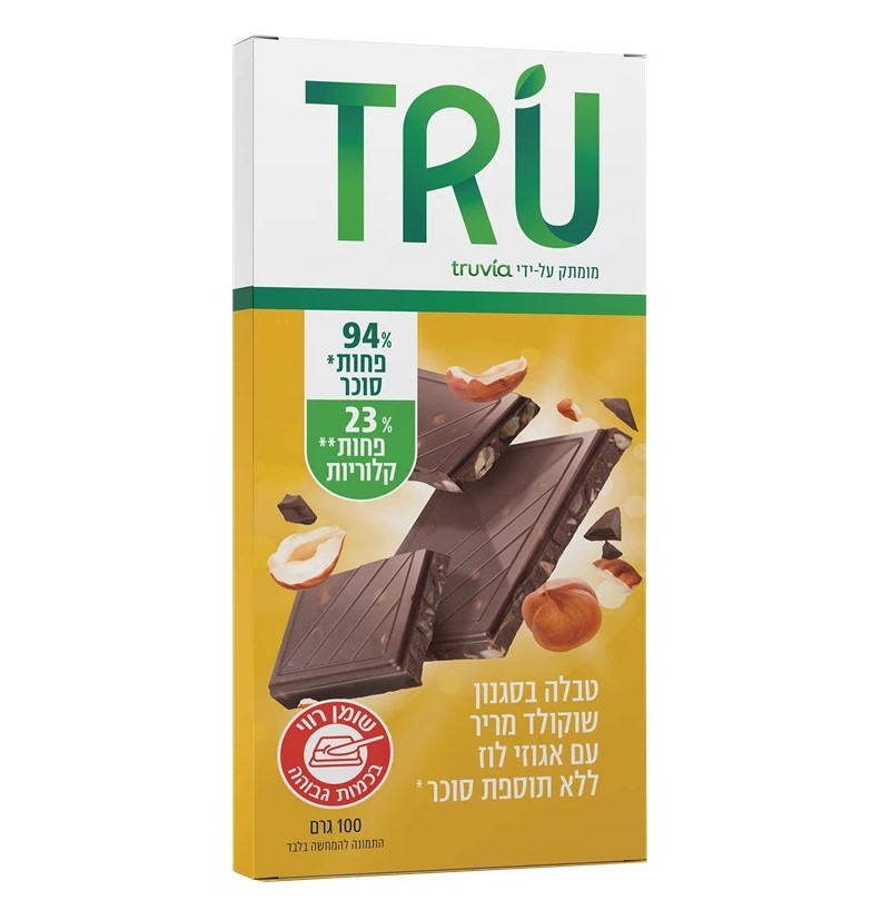 טבלת השוקולד המריר של TRÚ מזמינה אתכם לחוויית טעמים עשירה המשלבת שוקולד מריר איכותי עם אגוזי לוז מובחרים. בזכות השימוש בממתיק Truvia, תוכלו להתמסר למתיקות המלטפת ללא תוספת סוכר ועם 94% פחות סוכר בהשוואה לשוקולד רגיל. עם 23% פחות קלוריות, זהו השוקולד המושלם למי שמחפש פתרון איכותי וטעים המשתלב באורח חיים מאוזן. המרקם הנימוח של השוקולד לצד הפריכות של האגוזים יוצרים רגעי הנאה אמיתיים בכל נגיסה.