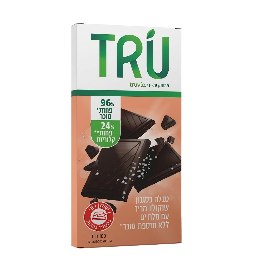 טבלת השוקולד המריר של TRÚ מביאה אליכם את השילוב הקולינרי המתוחכם של מתיקות עמוקה וניגודיות עדינה של מלח ים. השוקולד ממותק באמצעות Truvia, מה שמאפשר לכם ליהנות מטעם עשיר ללא תוספת סוכר ועם 96% פחות סוכר בהשוואה לשוקולד סטנדרטי. עם 24% פחות קלוריות, זוהי הבחירה האידיאלית למי שרוצה להתפנק בשוקולד מריר איכותי תוך שמירה על תזונה מאוזנת. המרקם החלק והשילוב המדויק של המלח יוצרים חוויית טעם בלתי נשכחת בכל קובייה.