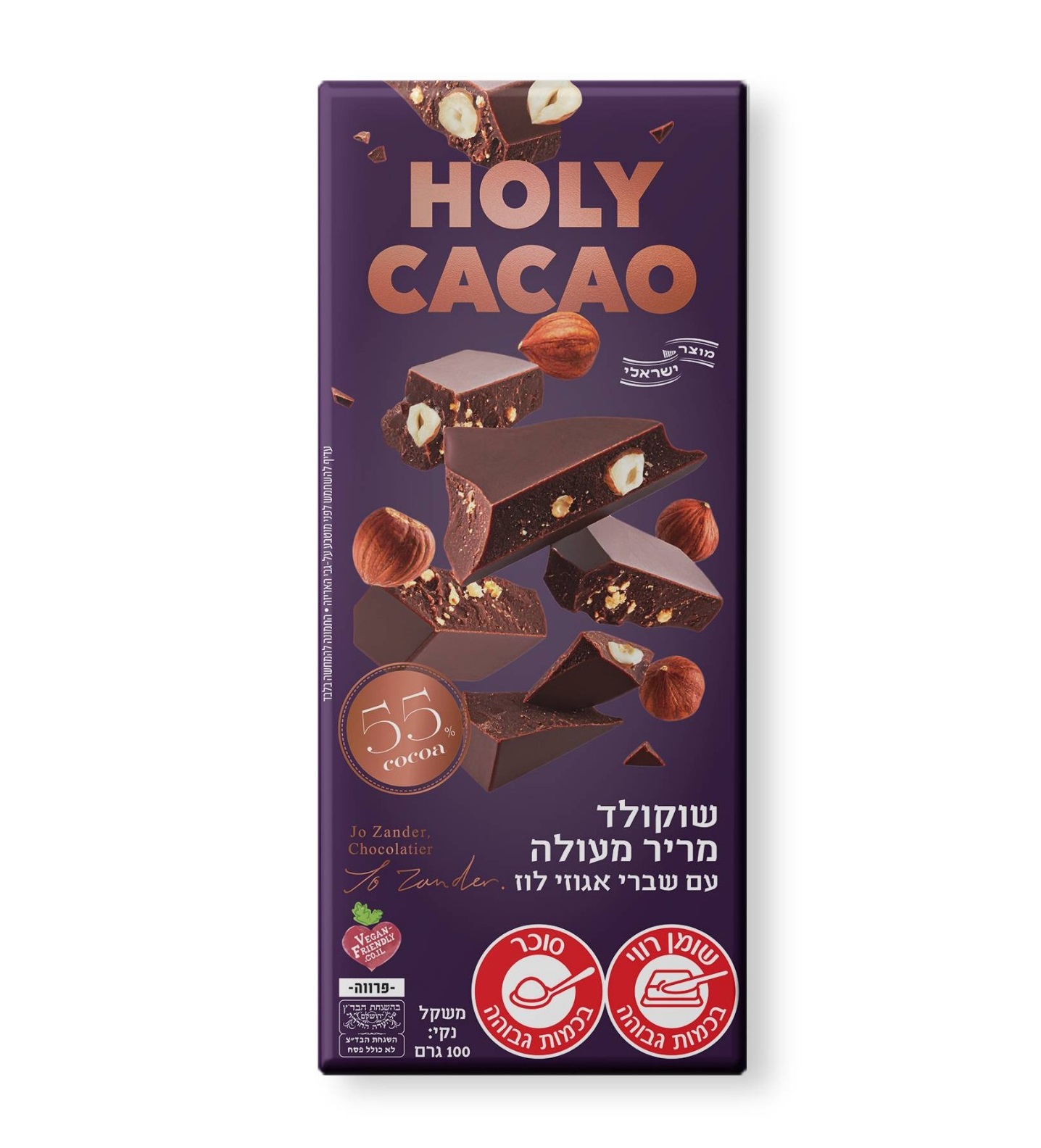 שוקולד מריר טבעוני 55% קקאו בעל עומק טעמים מאוזן, המשולב בשברי אגוזי לוז קלויים שמוסיפים קראנץ' עדין וניחוח אגוזי טבעי. השילוב יוצר חוויית טעם עשירה והרמונית.