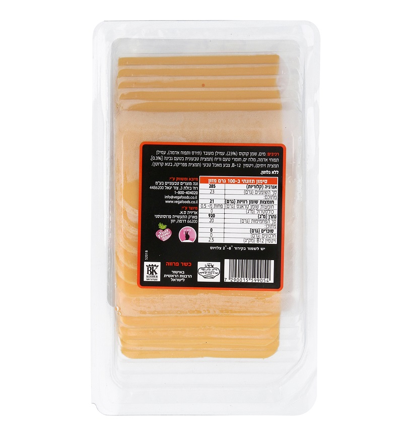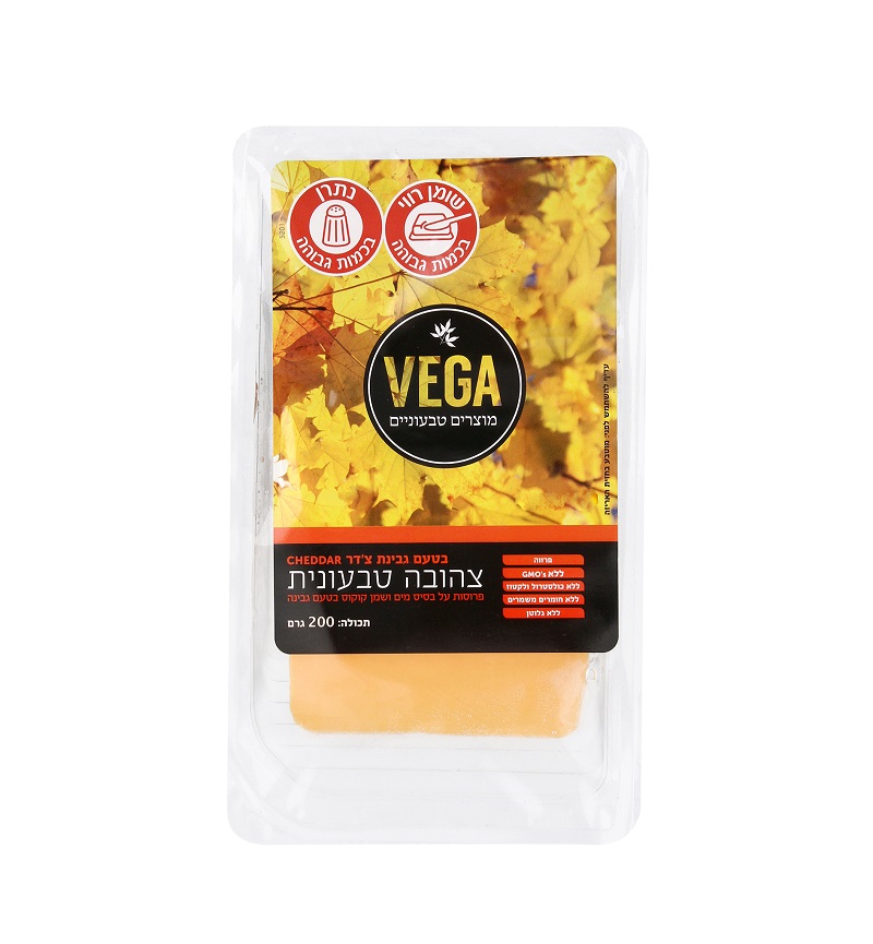 תחליף גבינה צהובה בטעם צ'דר מבית וגה, המבוסס על רכיבים מן הצומח, עם מרקם נעים וטעם עשיר המדמה גבינה קלאסית. מתאים לשילוב בכריכים, מאפים ומנות חמות, ומהווה פתרון נוח למטבח טבעוני ולתזונה מותאמת רגישויות.