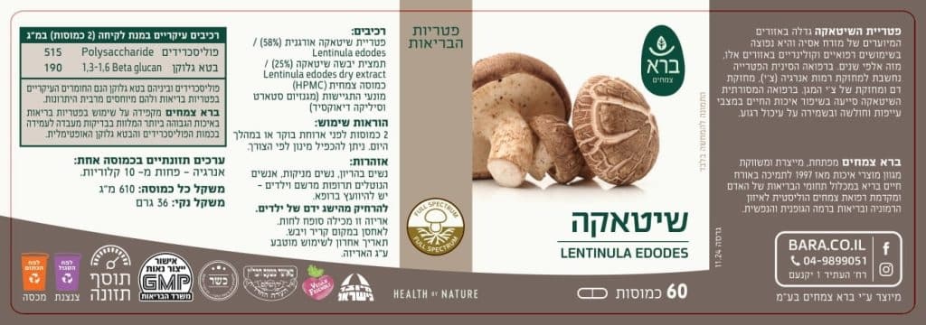 כמוסות שיטאקה מבית ברא, עשויות מאבקת פטריות Full Spectrum הכוללת את כל חלקי הפטרייה – גוף הפרי, התפטיר, הנבגים והתרכובת החוץ-תאית. הפטרייה גדלה באזורים מיוערים במזרח אסיה, ידועה בטעם ייחודי ובהרכב תזונתי עשיר.
